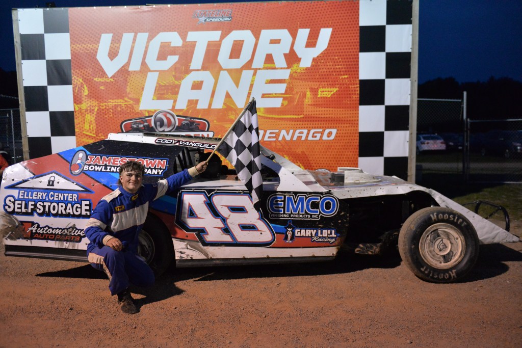 Ward Schell led early with David Parker and Zack Carley in pursuit. Jason Genco used the top groove to move from sixth to first by Lap 4. In a caution-heavy race, Genco maintained the lead and captured the win—tying the all-time RUSH Late Model wins record at Stateline Speedway.