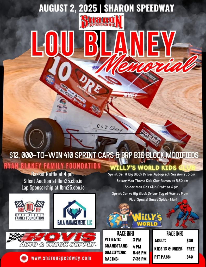 17TH ANNUAL “LOU BLANEY MEMORIAL” SATURDAY AT SHARON; $12,000 TO-WIN/$1,200 TO-START FOR “410” SPRINTS PLUS BRP MOD TOUR; BONUSES, FAN GIVEAWAYS, ACTIVITIES & MORE