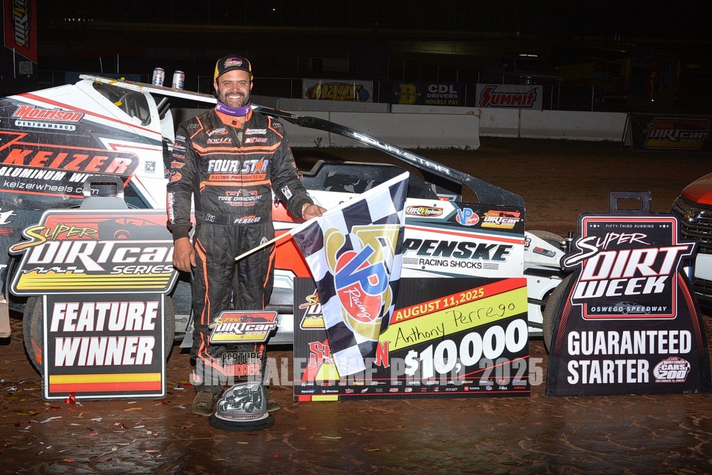 Making his first ever appearance at Sharon, Anthony Perrego led all 75 caution-free laps of the “Steel Valley 75” holding off 10-time Super DIRTcar Series Champion, Matt Sheppard, for his first Series win of 2025! Perrego earned $10,000 and a guaranteed starting spot for Super DIRT Week at Oswego Speedway in October.