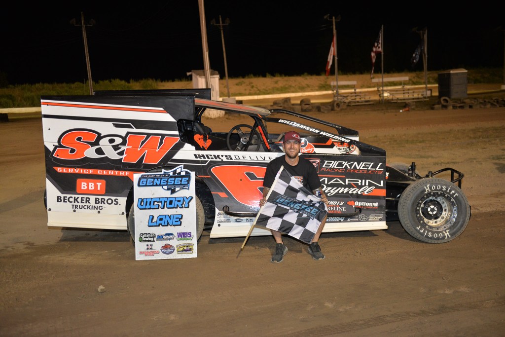 (Jeremy Perry, Batavia, NY) On one of the most anticipated nights of the season, The Dirt Track at Genesee welcomed the Big Block Modifieds for the Big Block/Small Block Challenge and the highly anticipated return of the Kyle Inman Tribute. With perfect weather and a stellar crowd in attendance, 18 Modifieds and 29 Sportsman cars filled the pits. In the 40-lap Big Block/Small Block Challenge, Mat Williamson of St. Catharines, ON, Canada, and Justin Wright led the field to green, with Wright seizing the early advantage. The red flag flew on lap four after contact between Ron Cartwright and Andrew Smith down the backstretch triggered a chain-reaction crash, sending Billy Bleich upside down in the Glenn Styres-owned car. Shannon Whaley also sustained heavy contact. On the restart, Wright again pulled away, but on lap six Erick Rudolph clipped the yuke tire and spun. Wright continued to dominate on restarts, holding a 1.905-second lead over Williamson on lap 20 when Gary Lindberg brought out a yellow. This time, Wright couldn’t escape the pressure, and on lap 25, Williamson made a perfectly executed slide job in turns three and four to take the lead. The final caution fell on lap 27 for Cartwright, but Williamson drove away on the restart, leading the rest of the way to claim the $4,000 payday. “I was trying to save it for the end, and we got to the halfway mark and I knew I had to go,” Williamson said. “I went to the top of 1 & 2, got a run down the back straightaway, and was able to slide him in 3 & 4.”