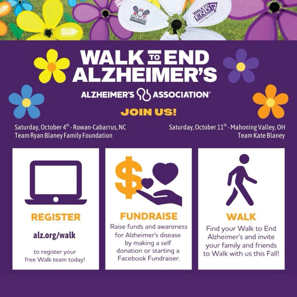 We walk for the ones we love, the ones we have lost, and the ones who will face Alzheimer’s tomorrow. 💜 Join our teams for the Walk to End Alzheimer’s and stand with us in the fight for a world without Alzheimer’s. Go to https://alz.org/walk and go to ‘Find A Team’. Use Team Name Ryan Blaney Family Foundation for the NC walk and Team Name Kate Blaney for the OH walk. #rbff #alzheimers #alzheimersawareness #endalz